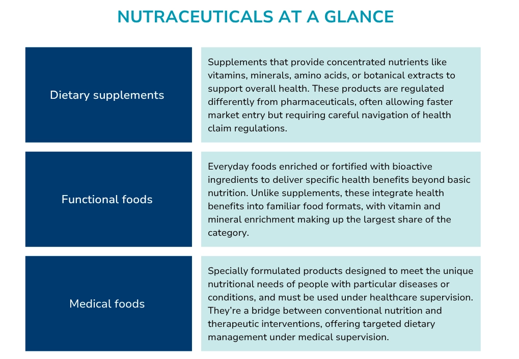 Nutraceuticals enjoy faster market entry but face ongoing compliance challenges. Unlike pharmaceuticals, they often bypass formal approval pathways, enabling quicker commercialization. This does come with trade-offs: Europe’s EFSA for example lacks clear distinction between food supplements and nutraceuticals in health claim assessments, making compliance and market positioning a challenge since each region may treat the same product differently. There are also hurdles in proving efficacy in healthy populations, and quality control issues from raw material sourcing that can trigger costly recalls. Medical foods are subject to more rigorous scientific and regulatory requirements with longer development timelines. They must demonstrate efficacy in managing specific diseases under physician supervision and are governed by distinct regulatory frameworks.