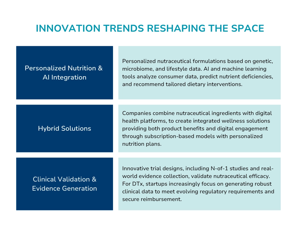 Innovation and investment across both sectors are ramping up to meet the need. Nutraceuticals saw 960+ funded companies raise $9.53 billion in 2024, with digital health startups securing $10.1 billion across 497 deals.9 Multiple catalysts are behind the surge: rising health consciousness post-COVID, demand for personalized solutions, and new technologies enabling better patient outcomes. Europe’s evolving regulatory frameworks – particularly Germany’s DiGA pathway – is also attracting capital to digital health, with European early-stage investments now rivaling U.S. levels.